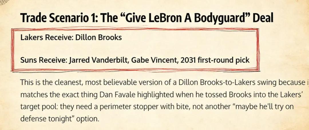 美媒《Fadeaway World》撰文建议,湖人应该打包送出范德比尔特、文森特以及2031年的首轮签,引入太阳前锋狄龙·布鲁克斯。